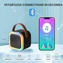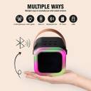 • Portable Mic: The included rechargable portable mic ensures your voice is heard loud and clear, making it ideal for presentations, karaoke nights, public speaking, and more. The microphone's wireless functionality adds to your convenience and mobility., Voice Changing Mode: Unleash your creativity with 3 voice changing modes, offering a variety of fun and quirky vocal effects adding an element of entertainment to your performances., High-Quality Audio: Immerse yourself in crystal-clear. sound output that fills any room. The speaker delivers rich bass, balanced midranges, and crisp highs for an exceptional audio experience., Bluetooth Connectivity: Seamlessly connect your devices using Bluetooth 5.3 technology. Pair your smartphone, tablet, or laptop to the speaker wirelessly and enjoy music or podcasts without the hassle of cords., Diverse Audio Inputs: In addition to Bluetooth connectivity, the speaker features an AUX-in port, TF card slot, and USB port, providing multiple ways to play your music., Dynamic RGB Lights: Elevate your environment with mesmerizing LED lights that create a lively atmosphere for parties or relax with soothing ambient lighting., Long Battery Life: Enjoy extended playtime with the built-in rechargeable battery. Dance the night away or conduct meetings without worrying about running out of power., Intuitive Controls: Easily manage your music, calls & volume using the user-friendly control panel on the speaker. Adjust volume, change tracks, and answer calls with a touch of a button.