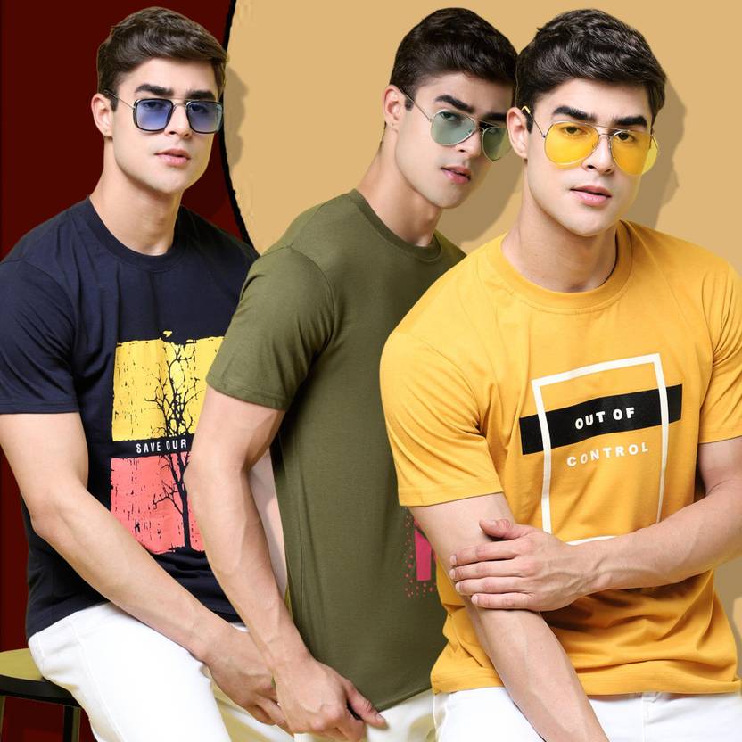 Pack of 3 Men Solid Round Neck Cotton Blend Dark Green, Navy Blue, Yellow T-Shirt