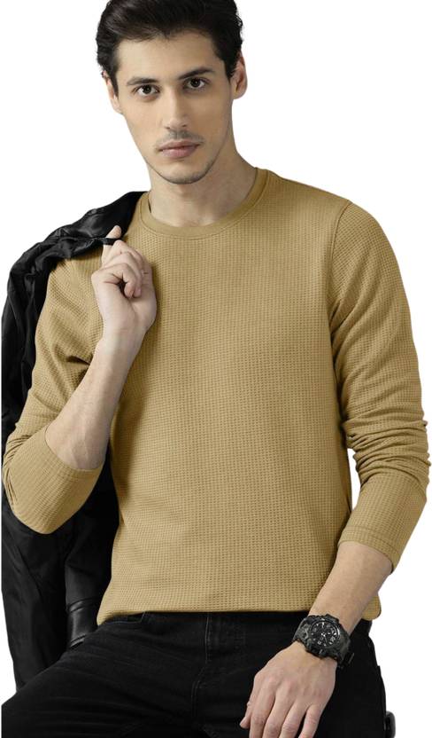 TEEMEX Solid Men Round Neck Beige T-Shirt