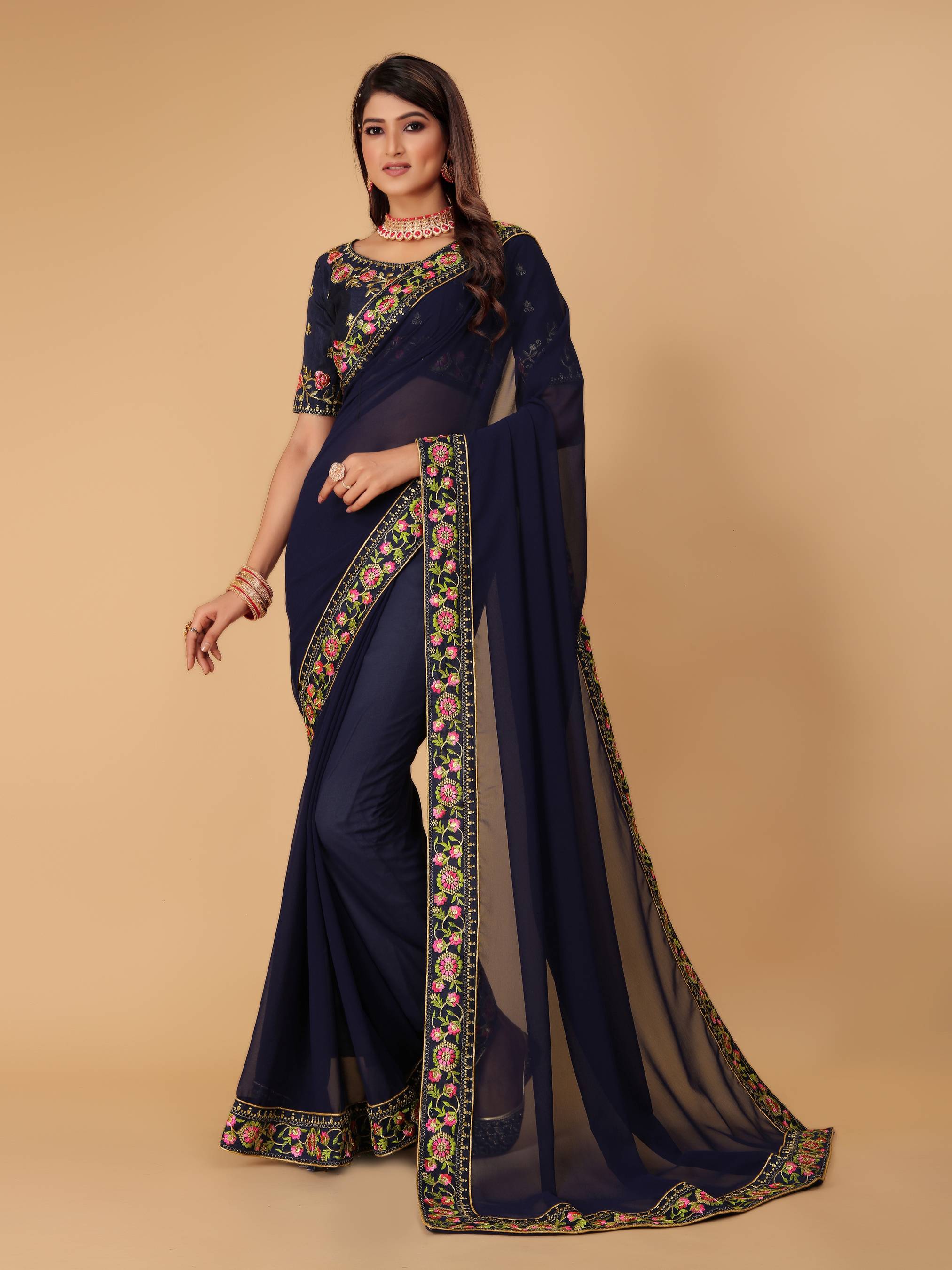 Tejal Creation Solid/Plain Bollywood Georgette Saree (Blue)