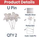 Add a touch of elegance and charm to your hairstyle with our Silver Flower U Pin. This beautiful hair accessory is designed to bring a luxurious flair to your look, perfect for bridal occasions, traditional saree styling, or even everyday elegance. Featuring a stunning flower design, this U pin is a versatile piece that enhances any hairstyle, from sophisticated braids to chic juda or open hair. Crafted with care and precision, the Silver Flower U Pin is a must-have accessory for those who love adding a floral touch to their styling. The beads and silver finish give the pin a stylish look that’s perfect for formal events or to complete your everyday look with a hint of luxury. Whether you're dressing up for a bridal ceremony or simply adding that extra bit of elegance to your braids, this hairpin is sure to make a statement. The versatility of this hairclip makes it perfect for all hair types, effortlessly blending into your braids, juda, or even loose, open hairstyles. Its secure design ensures that it will stay in place throughout the day, providing both beauty and function. Whether you’re looking to add flare to your saree look or create a delicate brooch effect in your hairstyle, the Silver Flower U Pin is your go-to accessory. Key Features: Beautiful flower design with high-quality silver finish. Embellished with beads for added sparkle and elegance. Ideal for bridal looks, saree styling, or enhancing braids, juda, or open hairstyles. Adds a floral touch to your hair, creating a stylish and sophisticated look. Versatile and secure hairclip that provides flare and completes your outfit with a luxurious finish. Perfect for any occasion, the Silver Flower U Pin is an essential addition to your hair accessories collection. Add a brooch-like charm to your hairstyle, making it ideal for weddings, festive celebrations, or simply elevating your everyday hair styling with a touch of flower-inspired elegance.