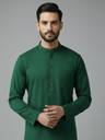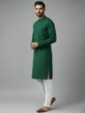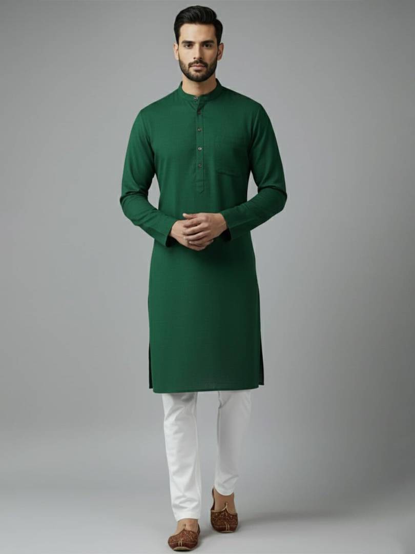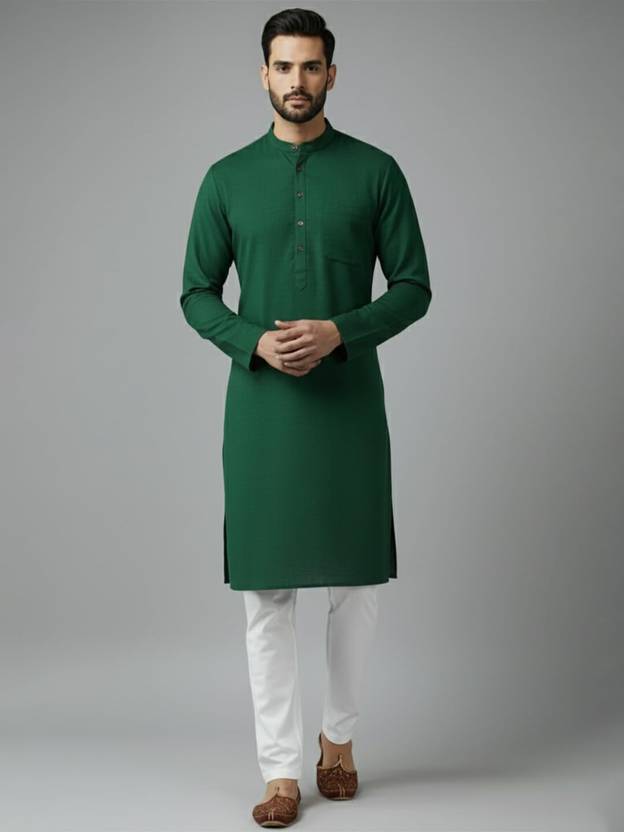 Elevate your ethnic wear collection with this sophisticated men's cotton kurta in a refreshing light green hue. The design features a contemporary mandarin collar and full-length sleeves, striking the perfect balance between traditional style and modern aesthetics. Crafted from pure cotton fabric, this kurta offers exceptional comfort and breathability, making it suitable for both casual outings and festive occasions. The straight cut silhouette paired with white trousers creates a refined look that's both elegant and versatile. The subtle texture of the fabric adds depth to the solid colour, while the front button placket allows for easy wear. This kurta can be styled with traditional bottoms or paired with modern alternatives like denims for a fusion look. The lightweight nature of the garment makes it an excellent choice for various seasons. For best results, gentle hand wash is recommended to maintain the kurta's pristine appearance.