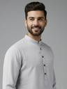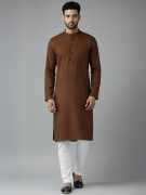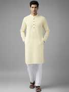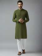 Elevate your ethnic wear collection with this sophisticated men's cotton kurta in a refreshing light green hue. The design features a contemporary mandarin collar and full-length sleeves, striking the perfect balance between traditional style and modern aesthetics. Crafted from pure cotton fabric, this kurta offers exceptional comfort and breathability, making it suitable for both casual outings and festive occasions. The straight cut silhouette paired with white trousers creates a refined look that's both elegant and versatile. The subtle texture of the fabric adds depth to the solid colour, while the front button placket allows for easy wear. This kurta can be styled with traditional bottoms or paired with modern alternatives like denims for a fusion look. The lightweight nature of the garment makes it an excellent choice for various seasons. For best results, gentle hand wash is recommended to maintain the kurta's pristine appearance.