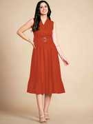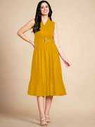 Entice the onlookers with this accordion pleats’ empire dress, has a gathered pattern & buttons in yoke, flared hem & matching belt to suit the style. This dress is both durable and stylish, making it a must-have for your affordable wardrobe collection. Complement this anytime with a piece of matching heels if you are going to office or a party & with classic sneakers if you want to just hang around with friends.