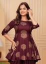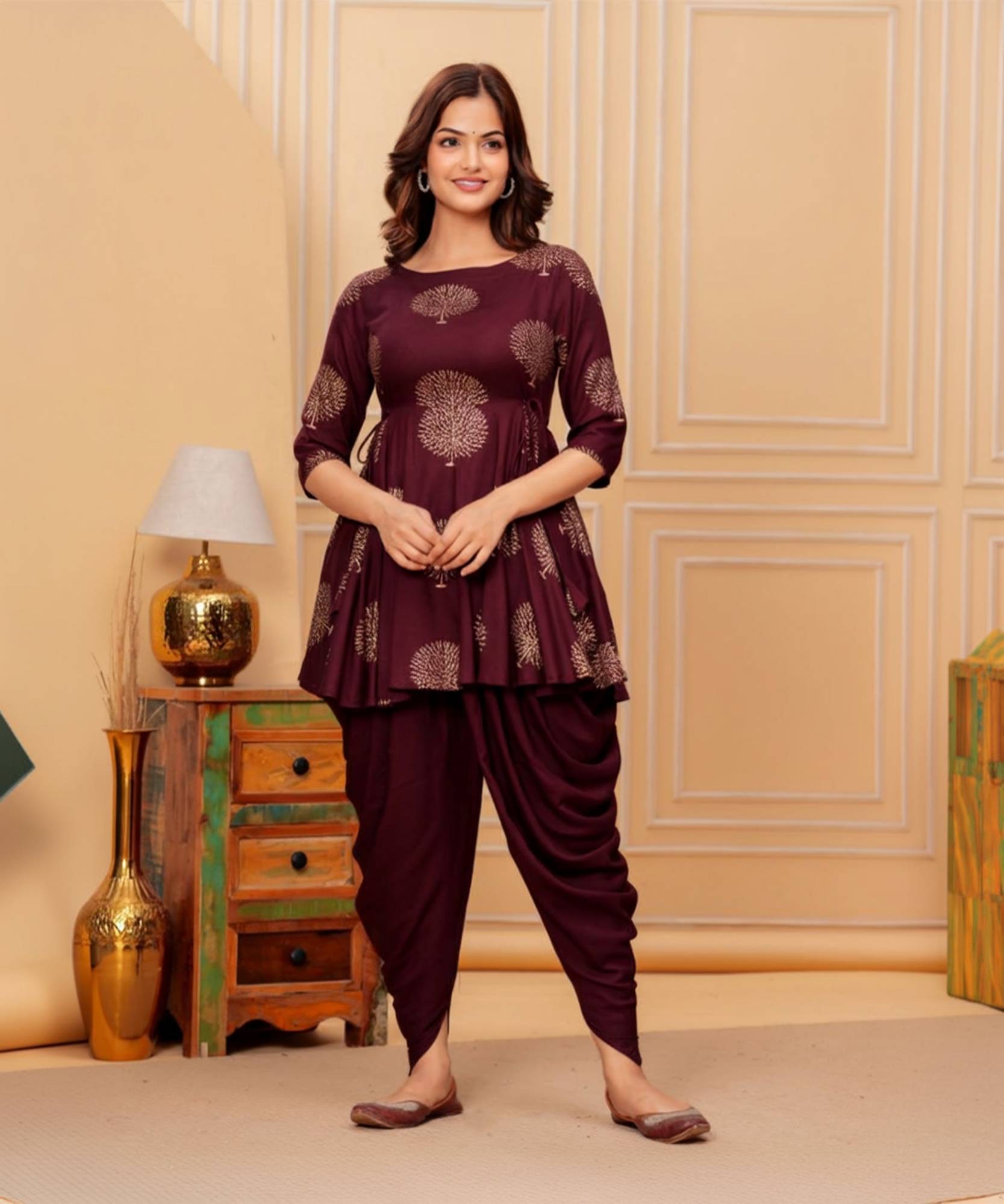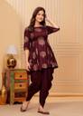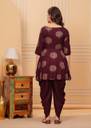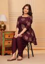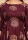 The Factory Point offers you this fashionable Kurta & Dhoti Pant comes with Wine Color Printed Anarkali Design, Exhibits 3/4th Sleeves & Round Neck ; Embellished With Dori for a versatile look & this kurta will keep you at easy all day long. womenkurtaset,kurtaandpantset,rayonkurtaset,goldprintkurtapantset,kurtaset,womenanarkalikurta, dhtoikurtasetforwomen,womensprinteddhotiset.