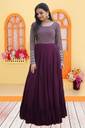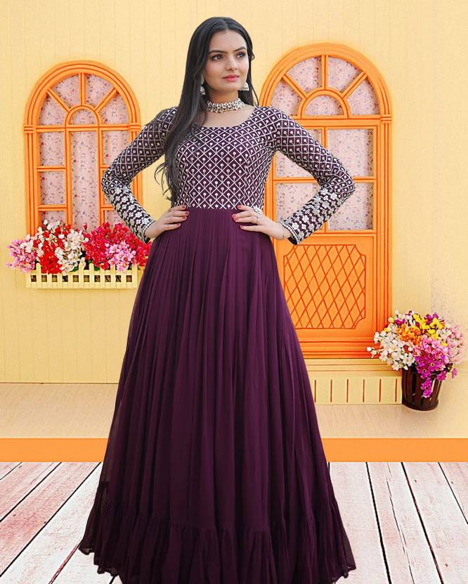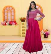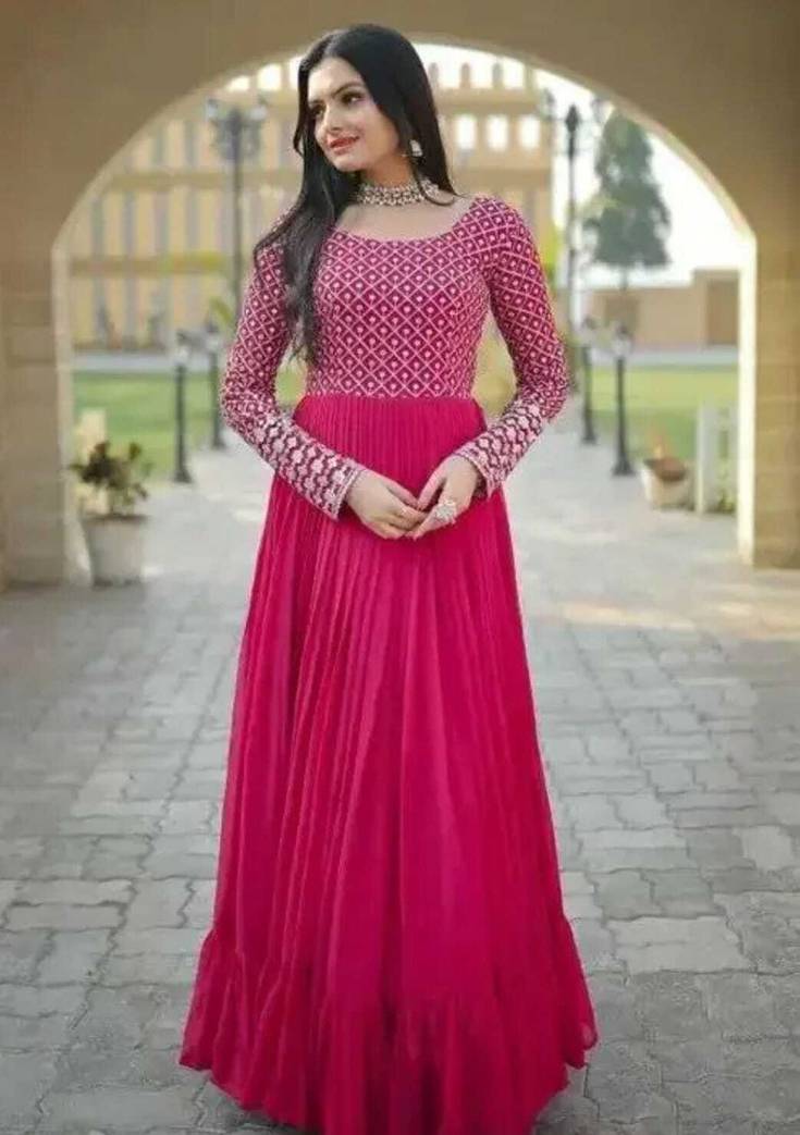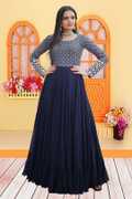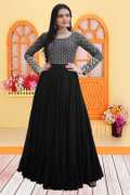Drape yourself in timeless elegance with this exquisite black Anarkali gown, a perfect fusion of traditional charm and contemporary sophistication. Crafted from flowy georgette fabric, the gown features a floor-length silhouette with a beautifully pleated skirt. The standout feature is the intricately embroidered bodice and sleeves, designed with delicate white thread work in floral and geometric motifs. The round neckline and full sleeves elevate its regal appeal, making it ideal for festive occasions, wedding functions, or evening parties.