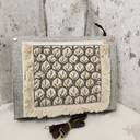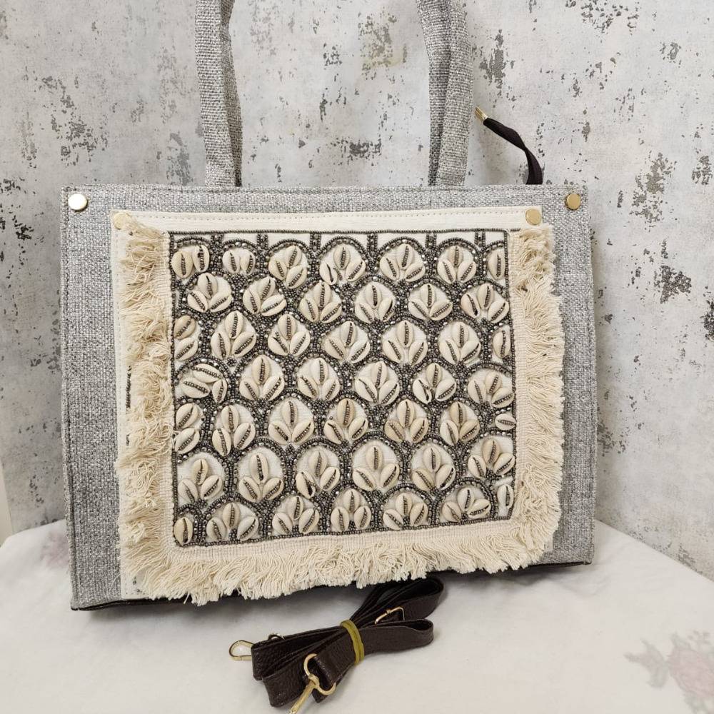 Elegant grey jute tote adorned with hand-embroidered cowrie shells, bead detailing, and fringed edges, offering a chic coastal-inspired look. Comes with a detachable shoulder strap for versatile use.