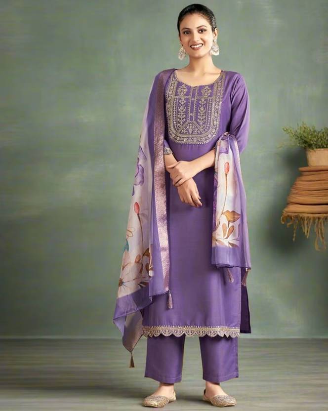 Look graceful and stylish in this Elegant Purple Embroidered Kurta Set. Designed from premium quality fabric, the kurta features intricate embroidery on the neckline and sleeves, paired with a soft printed dupatta. The set includes comfortable matching bottoms, making it perfect for festive occasions, parties, and ethnic gatherings.