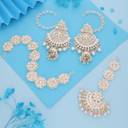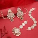 earring with mangtika for wedding. A Designer Pair Of Latest Mangtikka Earrings combo for Women traditional chandbali jhumkas with Kundan and pearls that will make a style statement. These jhumka golden earrings for women will go with any traditional wear. These combo of chandbali earrings with maang tikka is ideal for traditional Indian Function like wedding, engagement or festival occasions. These kundhan jhumka long earrings for women traditional are Easy To Wear and light in weight. This white gold jhumka mangtikka earring for women is stylish and is handcrafted In metal With Imitation Pearls. Chandbali Mangtikka jhumka earrings for women Dimensions: Height 4 inches x 2.5 inches. Package Contents: 1 Pair ethnic flower earrings jhumkas for women and mangtikka. Keep away from water, perfume, and other chemicals and clean it with a dry and soft cloth