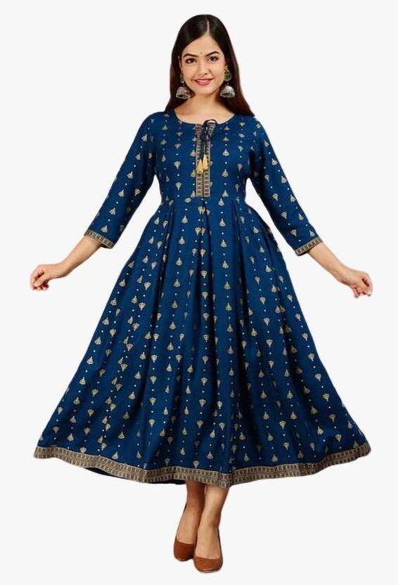 Women Printed Cotton Rayon Anarkali Kurta (Blue)