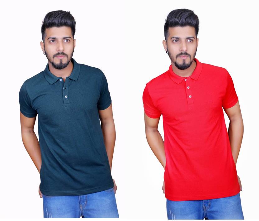 Pack of 2 Men Solid Polo Neck Polycotton Red, Green T-Shirt