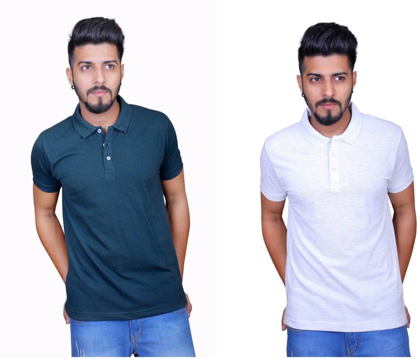 Pack of 2 Men Self Design, Solid Polo Neck Polycotton White, Blue T-Shirt