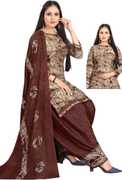 Style and design and trend would be at the peak of your attractiveness after you attire this Patiala dress material. This unstitched synthetic Italian leon crepe dress also comprises synthetic crepe bottom along with a Martina chiffon dupatta, all synchronized well with the latest trend and style. The beautiful stylish dress is uniquely crafted print work that makes this dress perfect for a modern woman. Specially designed to wear for casual, office wear, and kitty parties.