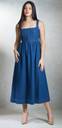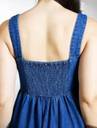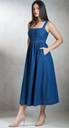 This dress is a stylish, sleeveless denim dress with a square neckline. The fitted bodice features buttons down the front, creating a vintage-inspired look. The dress flares out into a flowing, knee-length skirt, providing both comfort and elegance. The fabric has a classic denim texture, offering durability and a casual yet fashionable vibe. The dress is paired with a subtle pair of nude heels, adding a touch of sophistication. It’s perfect for warm-weather outings, offering a balance of laid-back style and refined charm.