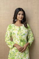 Owing to its round neck with drawstring closure and three-quarter sleeves, this kurta set offers a modern take on traditional style. The neckline adds a slight decorative element while remaining comfortable and practical. With its below-knee length, this kurta set provides balanced coverage. Lastly, the sleeve length ensures ease of movement while keeping the look modest and polished.