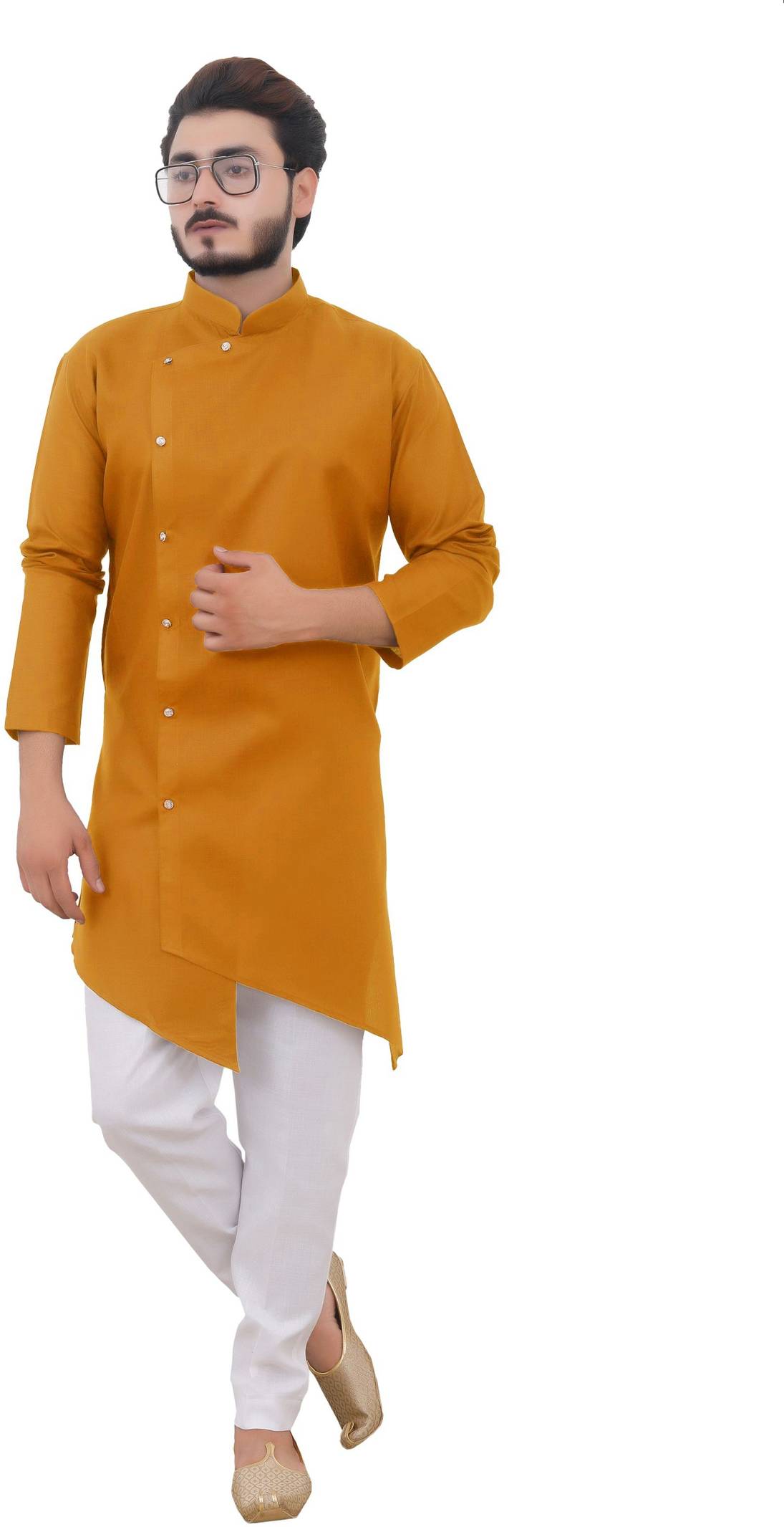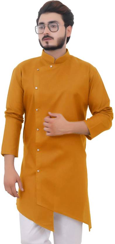 Tibra Collection Men Solid Cotton Blend Asymmetric Kurta  (Yellow)