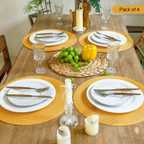 Upgrade your dining experience with this round placemat, designed to add a warm and stylish touch to your table décor. Made from durable, high-quality material, it features a classic circular pattern with a rich golden tone that complements both modern and traditional interiors. Ideal for daily dining, festive occasions, parties, and special gatherings, this placemat enhances table presentation while protecting surfaces. The placemat is heat-resistant and easy to clean, helping safeguard your dining table from hot dishes, spills, and scratches. Its sturdy yet lightweight construction ensures long-lasting use, while the non-slip weave keeps plates and bowls securely in place. Perfect for dining tables, coffee tables, and kitchen counters, this round woven placemat is a practical and elegant addition to your home décor.