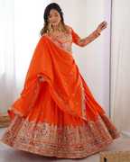 Welcome to the world of TILKI FASHION a place where premium quality and great value go hand in hand.This embroidered lehenga set for women features high-quality Silk fabric, delivering elegance and comfort.Our semi-stitched lehenga set offers flexible fitting up to 44 inches, making it the ideal lehenga or festival outfit.The timeless Lehenga Choli combined with heavy embroidery makes this lehenga set for women a must-have ethnic outfit. This Indian Wedding Outfit is a versatile choice for many occasions. For weddings and receptions, pair it with Kundan jewelry and heels for a royal finish. During festivals like Diwali, Navratri, or Eid, style it with jhumkas and flats or juttis for ease and elegance. For daytime poojas or intimate family gatherings, keep it light with temple jewelry and soft makeup. Whether styled minimally or richly layered, this Festive Wear Lehenga effortlessly adapts to your mood and event, making it a repeat favorite in your ethnic collection.Please Note :- The picture shown here is for reference only. Actual product may differ slightly in appearance and color to images shown.