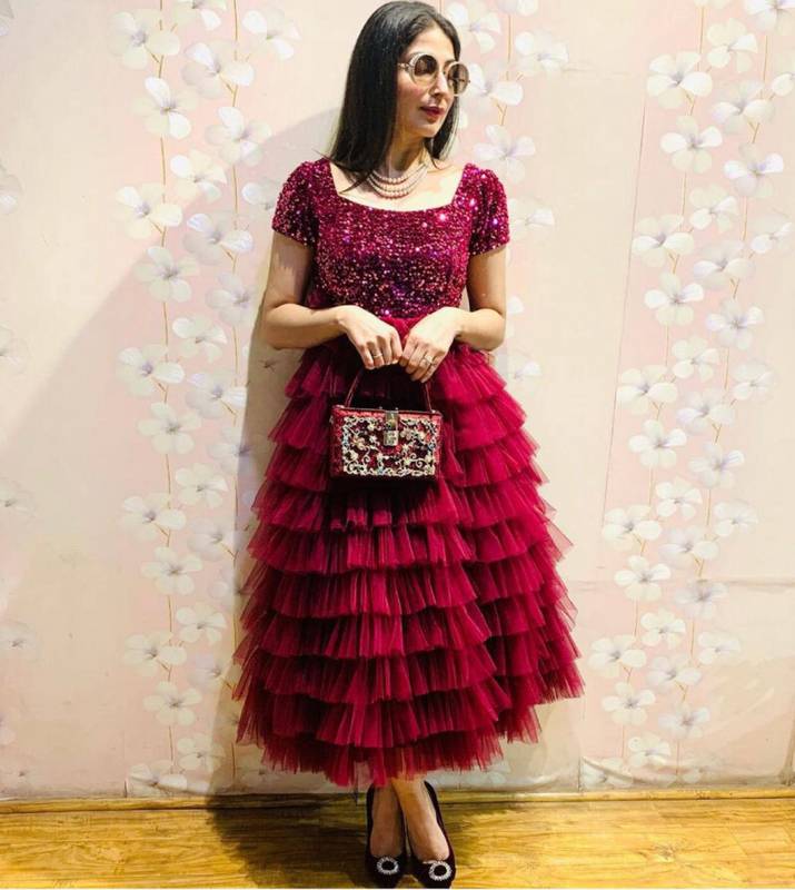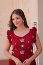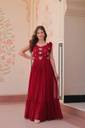 Women's Maroon Georgette Sequins Embroidered Ruffle Flared Gown