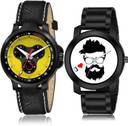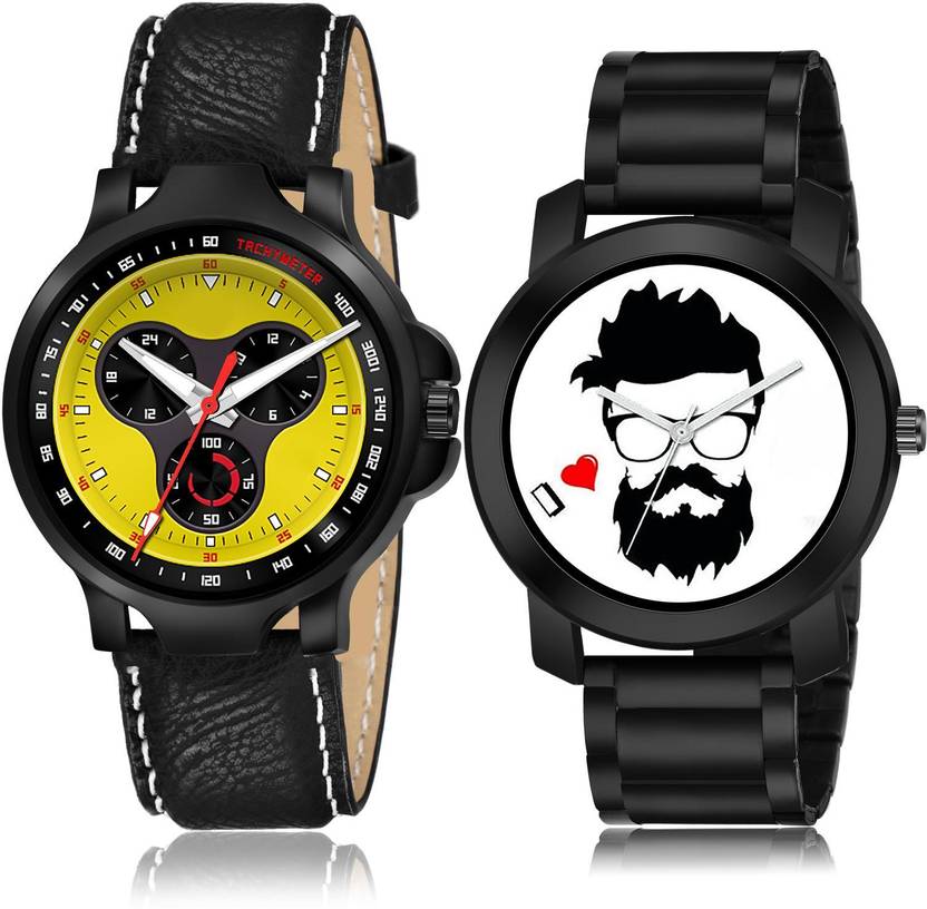 Dial Colour : Yellow And White ; Band Colour : Black ; Case Shape : Round ; Band Material : Genuine Leather And Stainless Steel ; Case Diameter : 44 And 47 mm ; TIMENTER Best Rich casual and beard style chain watch Black Colour Analog Genuine Leather And Stainless Steel Belt 2 Watch Combo For Boys And Men - S527-B824