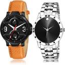 Dial Colour : Black ; Band Colour : Orange And Silver ; Case Shape : Round ; Band Material : Genuine Leather And Stainless Steel ; Case Diameter : 44 And 43 mm ; TIMENTER Treading Italian Designer professional and chain watch Orange And Silver Colour Analog Genuine Leather And Stainless Steel Belt 2 Watch Combo For Boys And Men - S528-B776