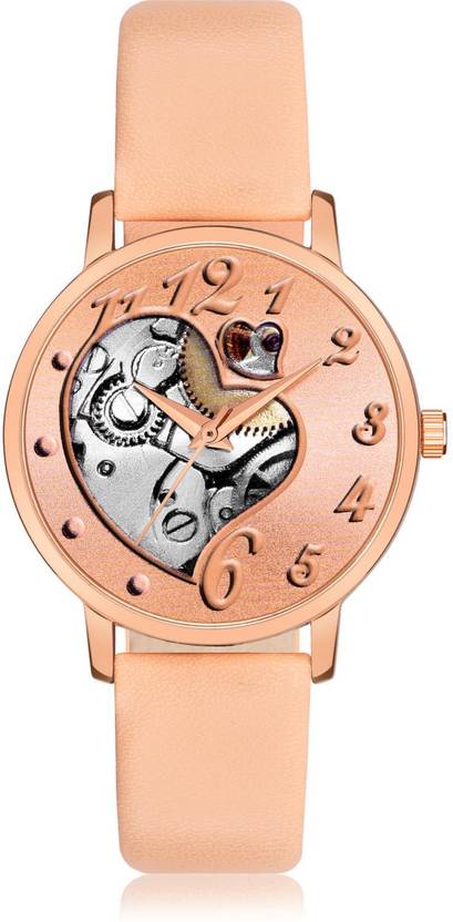 Dial Colour : Rose Gold ; Display Type : Analog ; Band Colour : Brown ; Band Material : Genuine Leather ; Case Shape : Round ; TIMETRANSELEVATE Modern Quartz love heart Brown Colour Analog Genuine Leather Belt Watch For Girls And Women - GM374