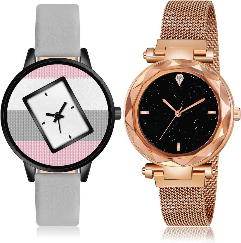 Dial Colour : Multicolor And Black ; Band Colour : Grey And Rose Gold ; Case Shape : Round ; Band Material : Genuine Leather And Stainless Steel ; Case Diameter : 36 And 33 mm ; TIMETRANSELEVATE Modern Casual casual genuine leather And magnet Grey And Rose Gold Colour Analog-Digital Genuine Leather And Stainless Steel Belt 2 Watch Combo For Women And Girls - GM547-GC5