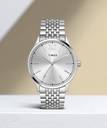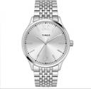 Timex Men's 39mm Brass Round Silver tone case Analog watch with silver dial and silver tone stainless steel bracelet.