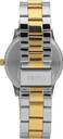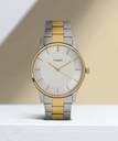 42mm mens sleek case with silver-gold two-tone bracelet and silver dial and modern clean aesthetics with festive sparkle.