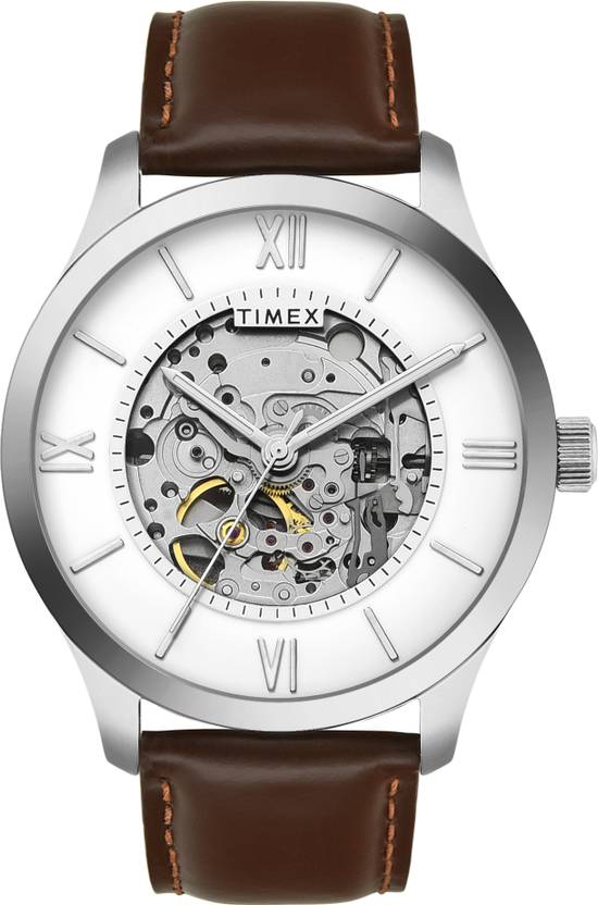 Timex Men's Automatic watch with 21 Jewel Japanese Mechanical Movement with Stainless Steel Case and White Skeletal Dial and Brown Leather Strap.