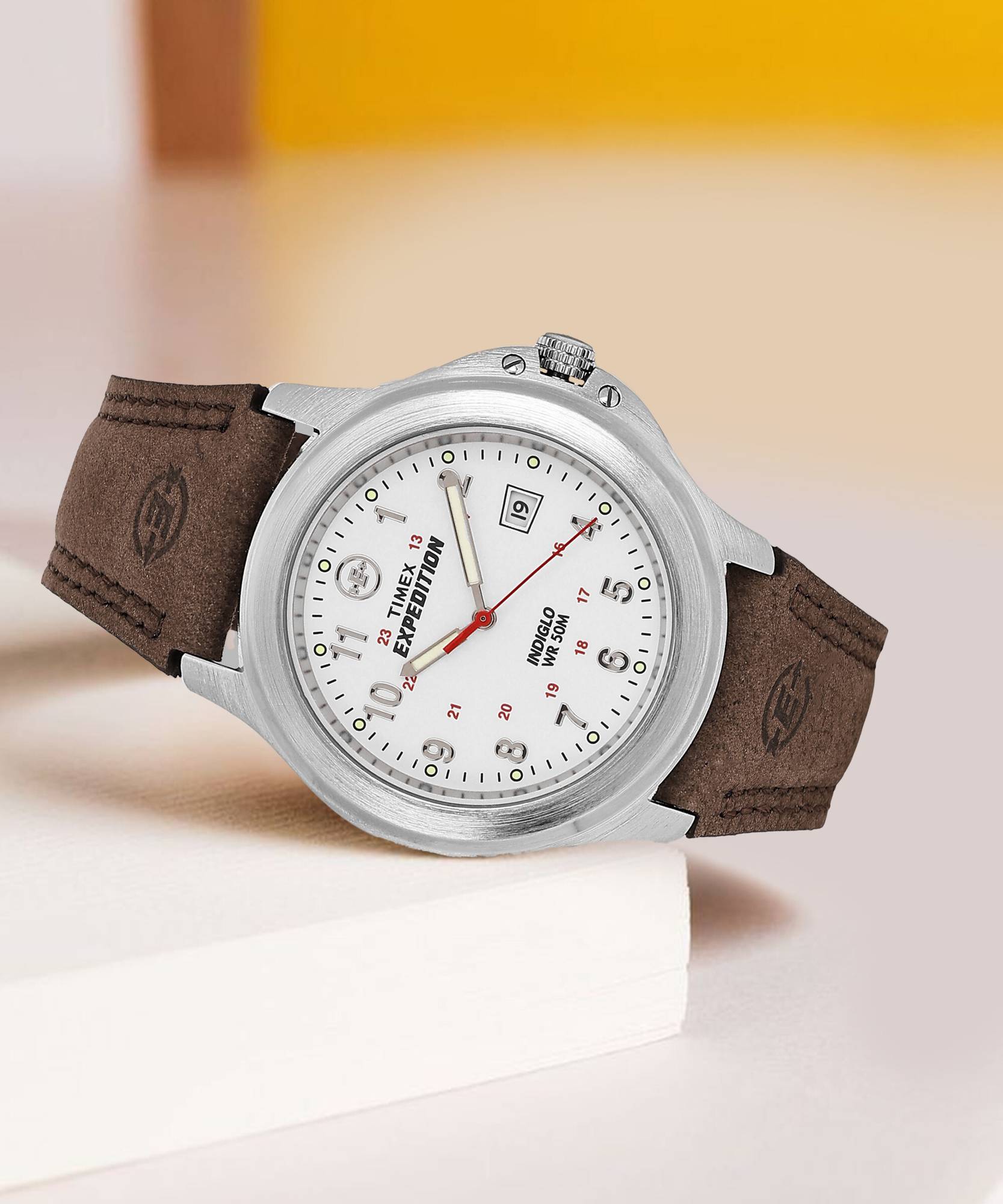 Timex Expedition Field Men 40mm round silver tone brass case, white date dial with INDIGLO backlight and brown leather strap.