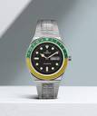 first released in the 1970s, our original q timex gave a new generation a modern watch with quartz technology. A natural evolution of our much-loved Q timex 1979 reissue watch, this adds new color to the iconic features of the original a green and yellow rotating bezel, woven silver stainless-steel bracelet, functional battery hatch and domed acrylic crystal. its everything you already loved, and then some. Black dial.