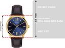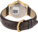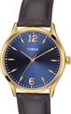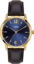 Timex Men's 39mm Brass Round Gold tone case Analog watch with blue dial and brown leather strap.