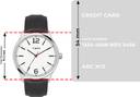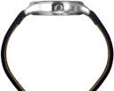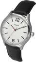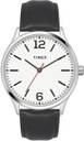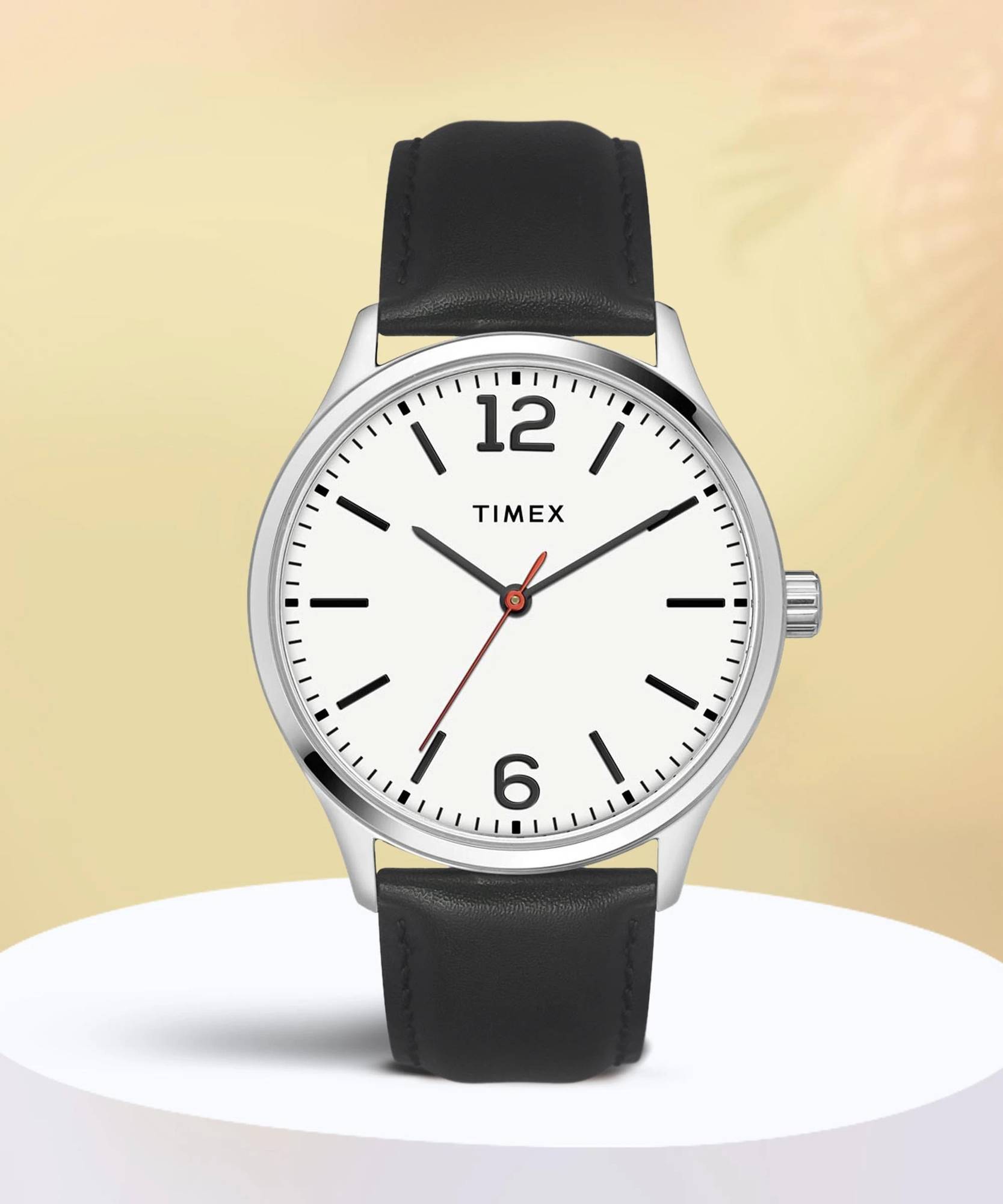 Timex Men's 39mm Brass Round Silver tone case Analog watch with white dial and black leather strap.