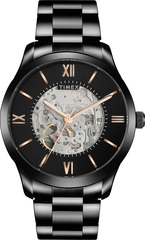 Timex Men's Automatic watch with 21 Jewel Japanese Mechanical Movement with Stainless Steel Case and Black Skeletal Dial and Black Stainless Steel Bracelet.