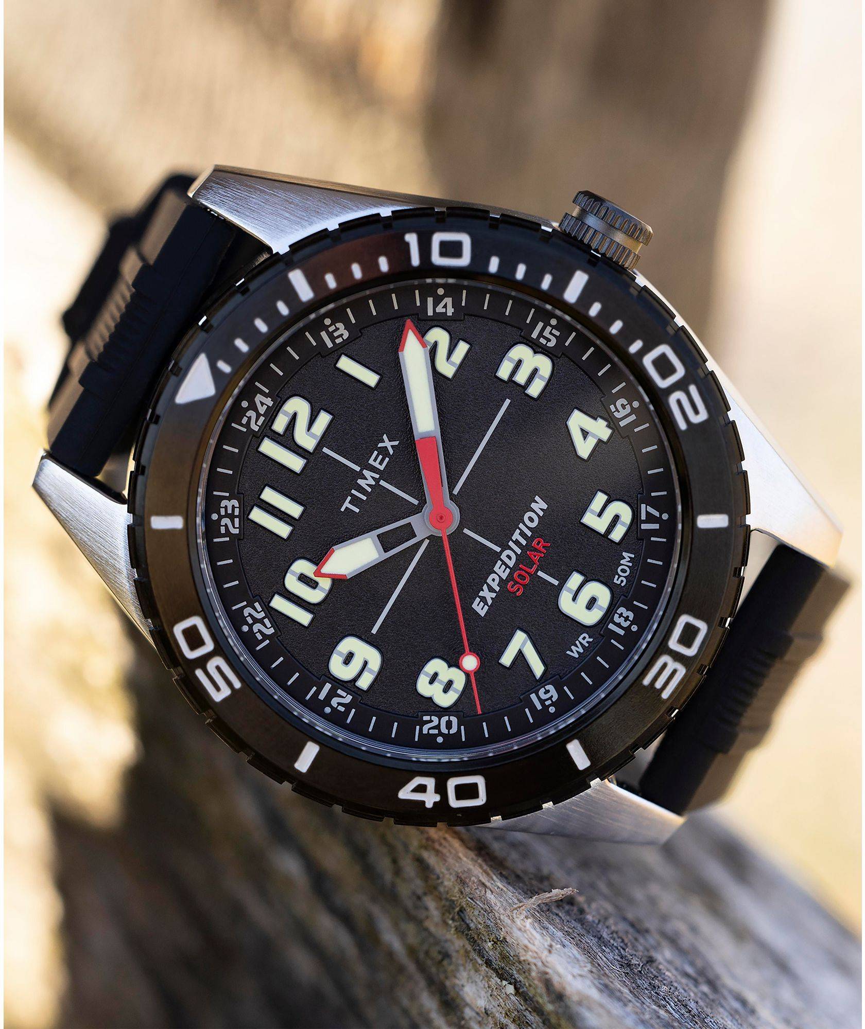 Featuring a Japanese solar-powered movement that lasts up to 4 months and eliminates the need for battery changes, our Expedition Field Solar is a military inspired outdoor watch made to accompany you anywhere. It also boasts a rugged two piece 43mm metal case, 50m water resistance rating, and a soft, black silicone strap. And thanks to the luminescent hands and dial markings, the sun works overtime to make this watch legible in the dark.