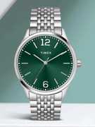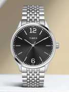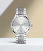 Timex Men's 39mm Brass Round Silver tone case Analog watch with black dial and silver tone stainless steel bracelet.