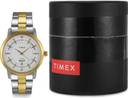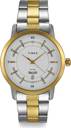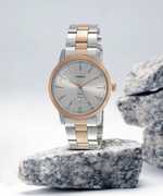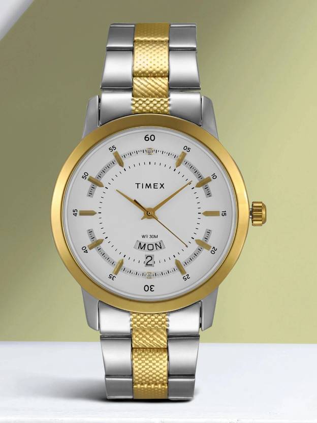 This watch has a neat white dial with gold-toned hands and a lustrous multi-metallic strap and bezel. It also has stones studded on its dial to enhance its appeal.