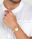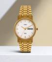A circular bezel tinted in striking gold gives this watch a masculine look. The dial is white in color and has baton markers that are also in gold. This timepiece also shows the date and day. A crown attached on its side allows to you control the time and date.