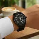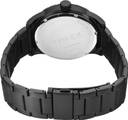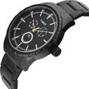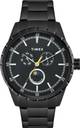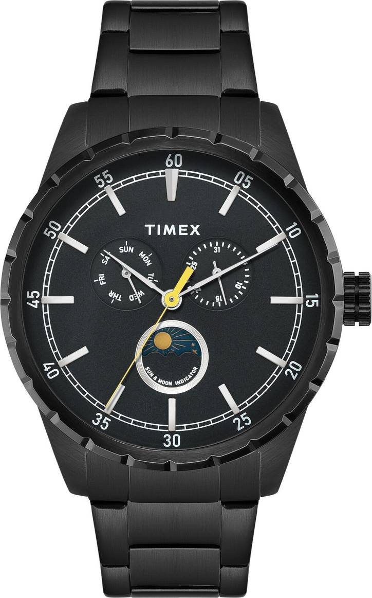 Timex Men 44mm Round Black Stainless Steel case and Black Mate Finish & Printed Moon Phase Multifunction dial and Black Stainless Steel Bracelet with Push Button clasp, mineral glass, quartz movement.
