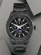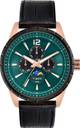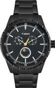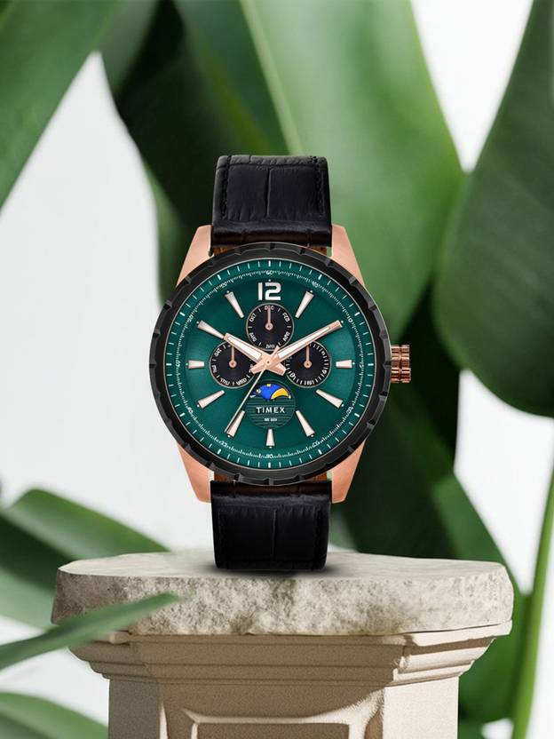 Timex Men 44mm Round Two-Tone Stainless Steel case with Green Moon Phase Multifunction dial and Black Leather Strap with Buckle clasp. Mineral Glass, Quartz Movement, Luminant Hands.