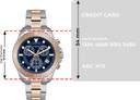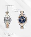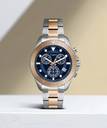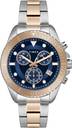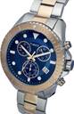 Dual tone rose gold and silver stainless steel chronograph watch with blue diver style dial and dual tone bracelet. Stainless Steel case with Mineral Glass.