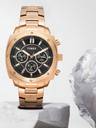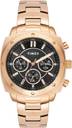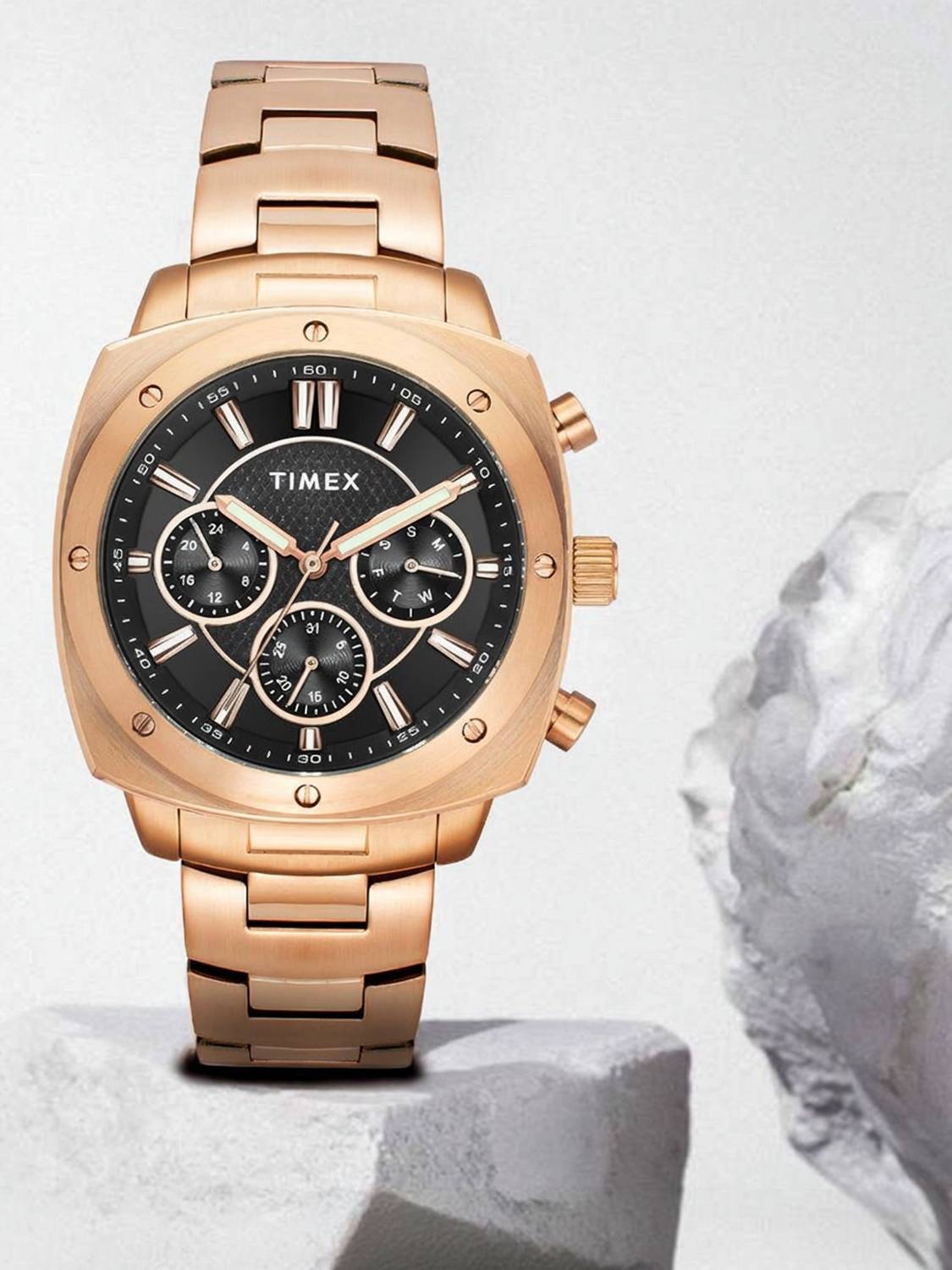 Timex Men's 43.5mm Square Rose Gold-Tone Stainless Steel Case with Black Multifunction Dial with Luminant Hands and Rose Gold-Tone Stainless Steel Bracelet with Push Button Clasp Clasp. Quartz Movement, Mineral Glass.