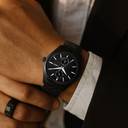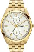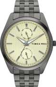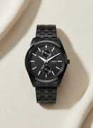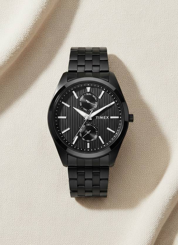 Timex Men 43mm Round Black Brass case and Black multifunction dial and sleek tapered hands with luminous ink fill, modern stamped minimal details with classic highlights, classic color schemes fused, and Black Stainless Steel bold multi-link Bracelet.