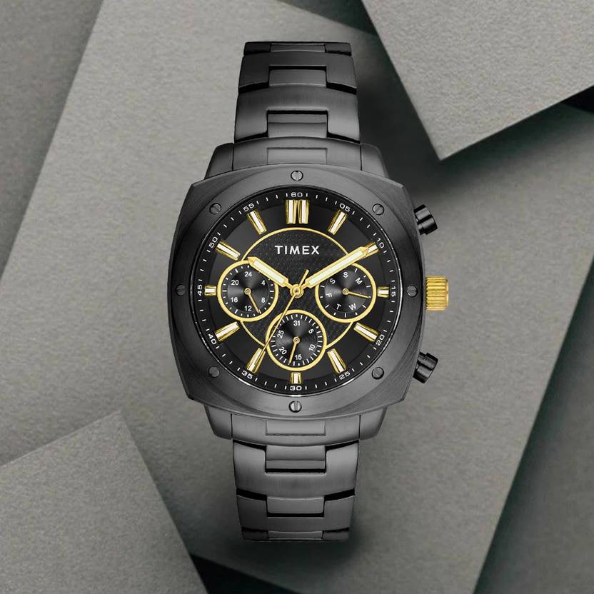 Timex Men's 43.5mm Square Black Stainless Steel Case with Black Multifunction Dial with Luminant Hands and Black Stainless Steel Bracelet with Push Button Clasp Clasp. Quartz Movement, Mineral Glass.