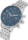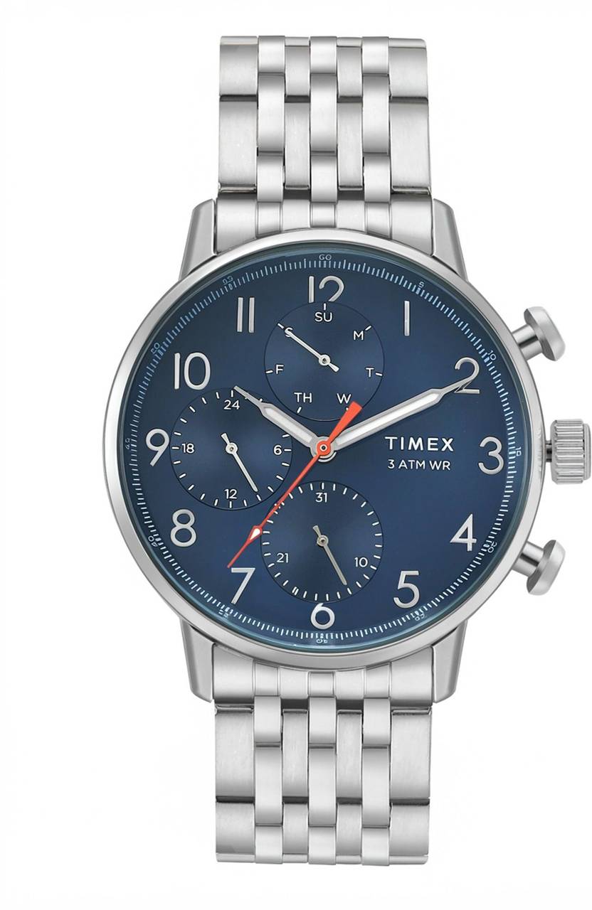 Timex Men, 41mm Round Silver-Tone Brass case with Blue Multifunction dial watch with Luminant Hands and Silver Stainless Steel Bracelet.