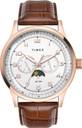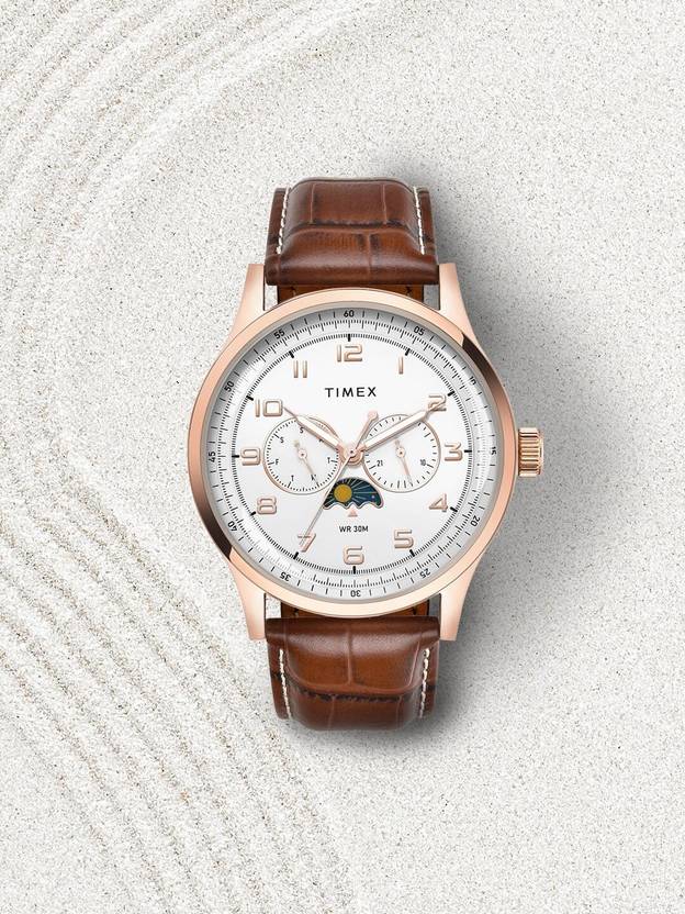 Timex Men's 45mm Round Rose Gold-Tone Stainless Steel Case with Grey Multifunction Dial with Luminant Hands and Brown Leather Strap with Tang Buckle Clasp. Quartz Movement, Mineral Glass.