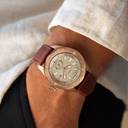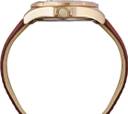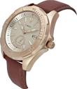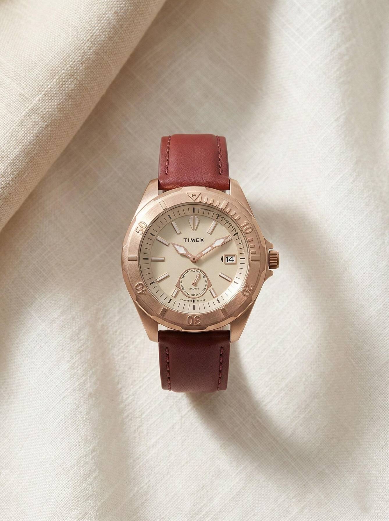 Timex Men 48mm Round Rose Gold Tone Brass case with modern bold diver aesthetic watch with balance bold detailing and Light Beige dial with date at 3H, remote second hand at 6H and unique index & hands design with luminous ink fill and Cherry Leather Strap.