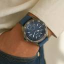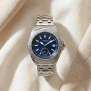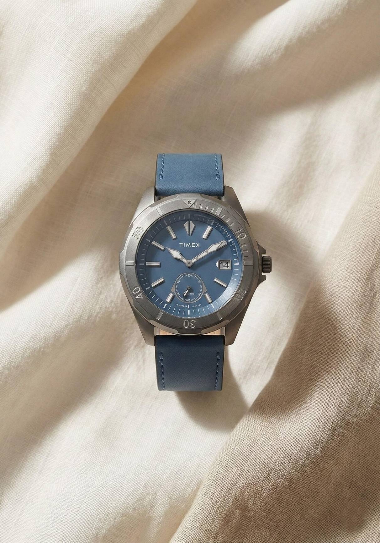 Timex Men 48mm Round Gunmetal Brass case with modern bold diver aesthetic watch with balance bold detailing and Dusk Blue dial with date at 3H, remote second hand at 6H and unique index & hands design with luminous ink fill and Dusk Blue Leather Strap.