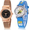 Dial Colour : Black And White ; Band Colour : Rose Gold And Blue ; Case Shape : Round ; Band Material : Metal And Plastic ; Case Diameter : 28 And 29 mm ; NEUTRON Brand New Diwali Magnetic Chain And Ben 10 Kids Rose Gold And Blue Colour Analog Metal And Plastic Belt 2 Watch Combo For Women And Girls - GW38-GC97